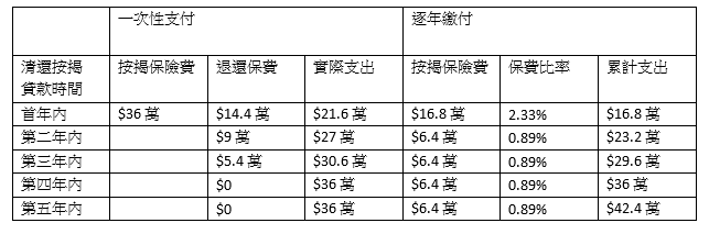 供款期為30,利率為浮息下,保費為銀行貸款的5%。即為800萬樓價9成720萬,之5%,36萬元。如在首年內贖按,即由9成按揭降為沒有按保下最高的6成按揭,可退還40%保費,即是14.4萬元,第二年內為9萬元,第三年內為5.4萬元。實際保費分別為21.6萬元、27萬元及30.6萬元。