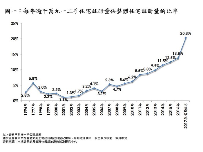 據美聯物業房地產數據及研究中心綜合土地註冊處資料顯示,今年首5個月住宅註冊量合共錄27,012宗,當中逾千萬元個案錄5,496宗,即佔約20.3%,為有紀錄以來首次達2成水平,創歷史新高,連升9年,比起去年全年約13.8%增加約6.5個百分點(見圖一)。