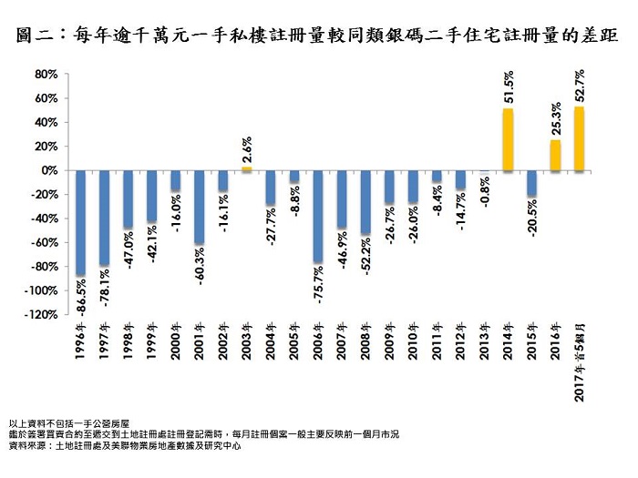 另一方面,今年逾千萬元新盤搶佔購買力情況相當顯著。若以今年首5個月逾千萬元個案按一手及二手劃分,當中一手物業高達3,321宗,比起同類銀碼的二手物業2,175宗大幅高出約52.7%,差距更為歷年紀錄最大。回顧近廿二年紀錄,逾千萬元一手宗數錄得超過二手只有4年,而情況主要於近年出現(見圖二)。