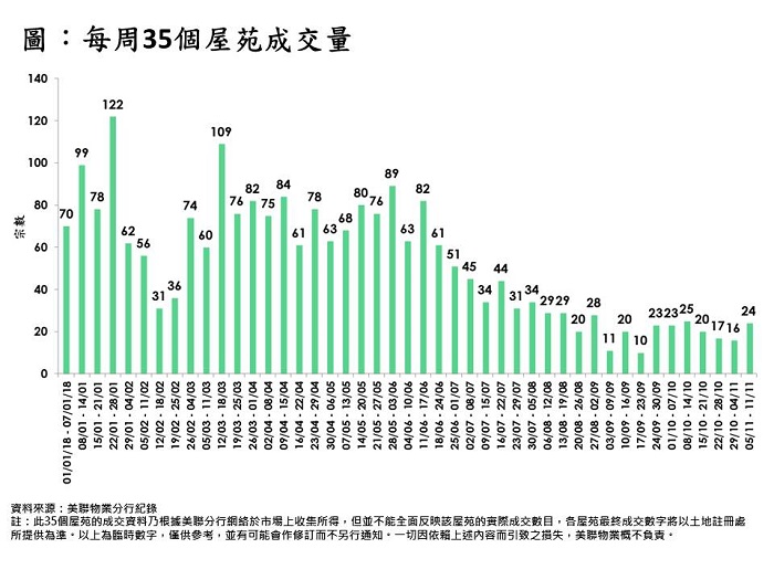 上周35屋苑二手交投回升,惟仍未擺脫低迷情況。綜合美聯分行資料,全港35個大型屋苑於過去一周(11月5日至11月11日)錄24宗買賣,較前一周(10月29日至11月4日)16宗回升約5成。由於前一周「基數」低,故即使按周「顯著」回升,但實際上僅24宗,低迷情況仍然持續(見圖)。