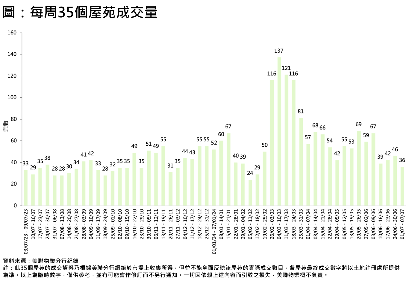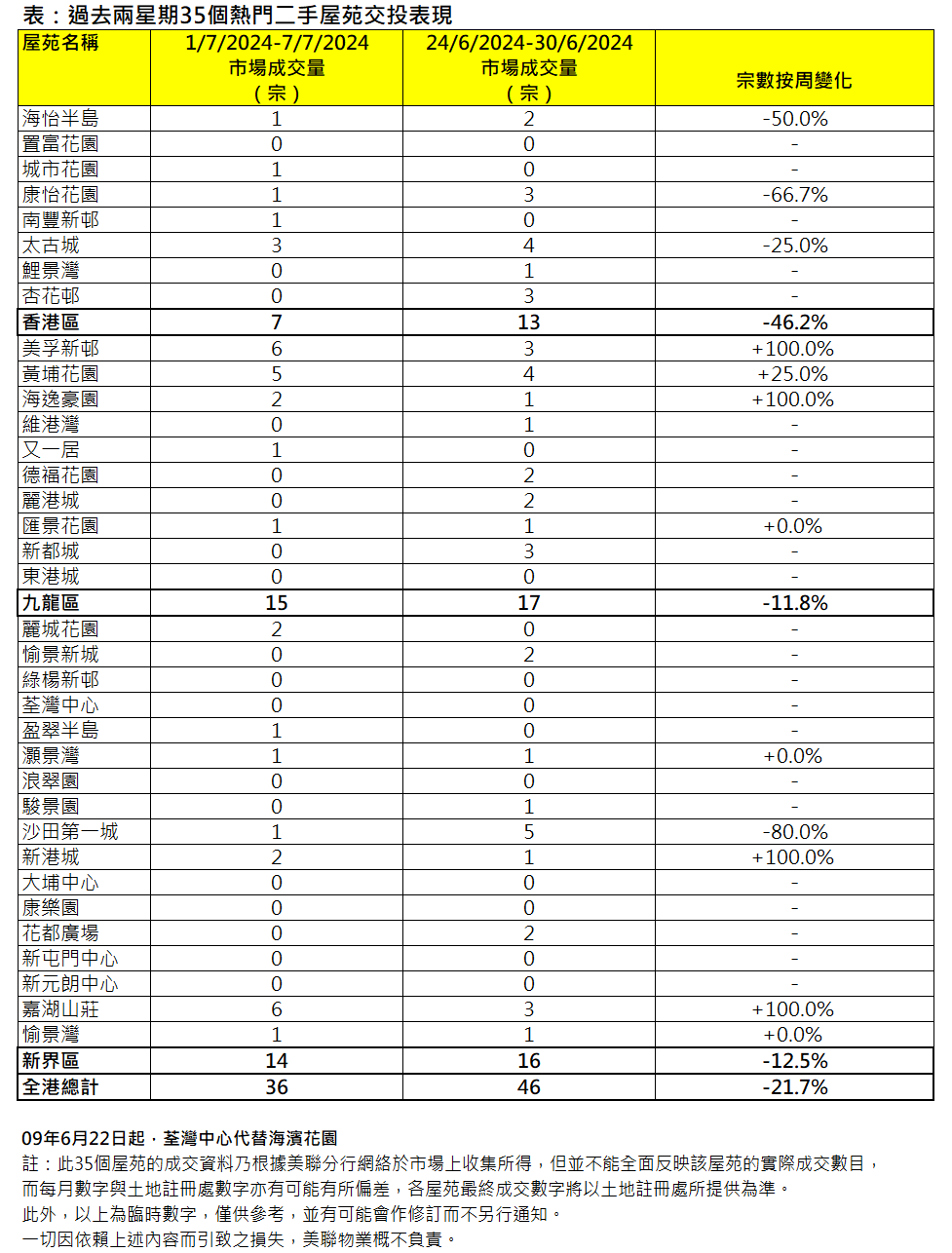 啟德區上周有矚目新盤以低價推出,搶去市場焦點及二手購買力,二手交投氣氛轉弱。綜合美聯分行資料顯示,全港35個大型屋苑過去一周(7月1日至7月7日)合共錄36宗成交,較前一周(6月24日至6月30日)的46宗按周減少約21.7%,並創撤辣後的新低(見圖)。