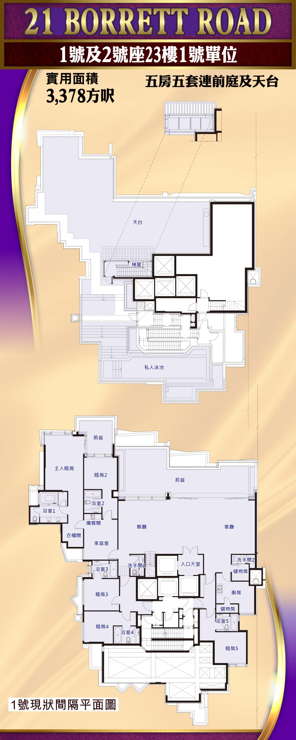 項目分兩期發展,由5座物業組成,提供181伙分層單位,其中第一期率先推售,涉及115伙,間隔以四、五房為主,實用面積介乎2075至3378方呎。