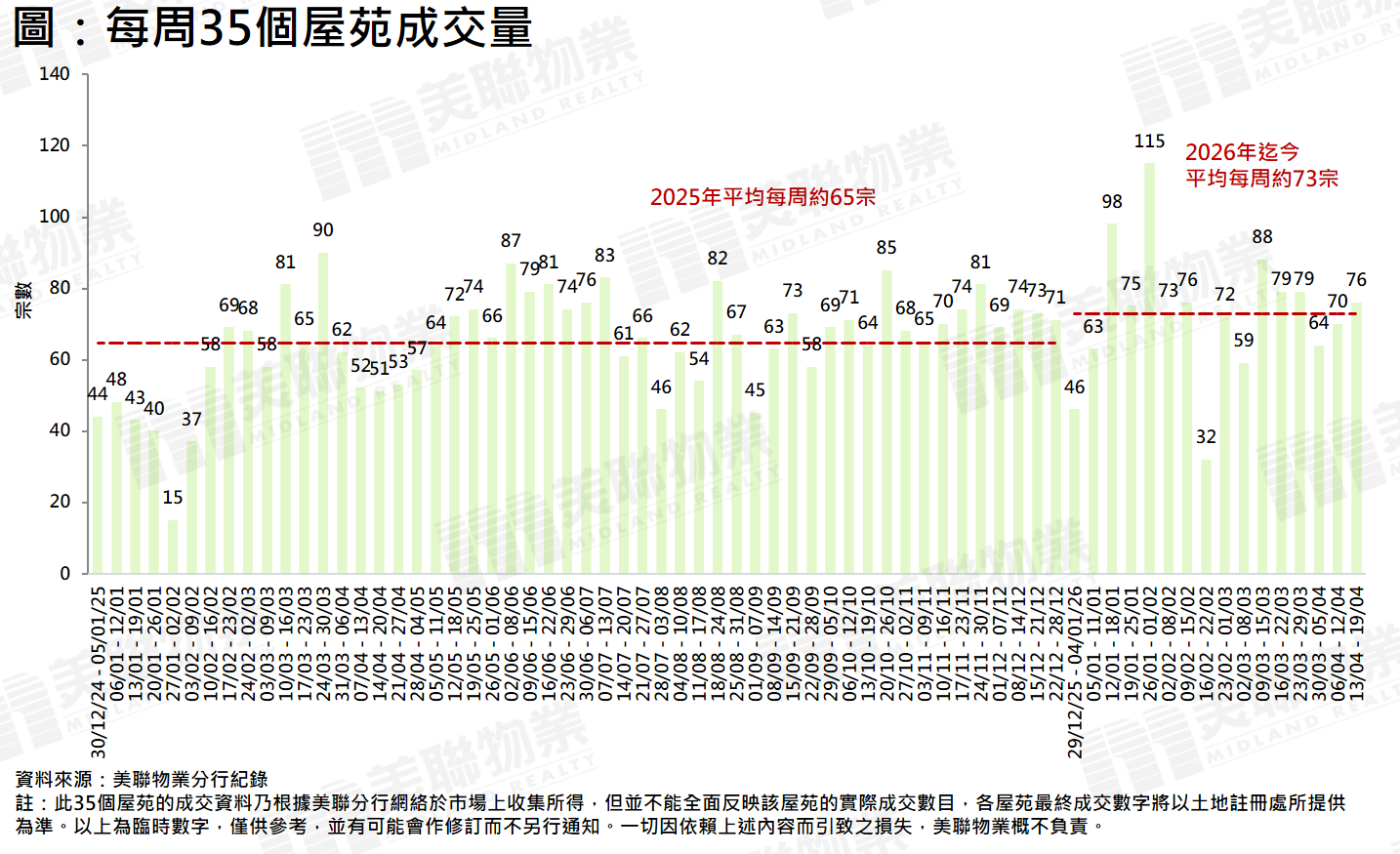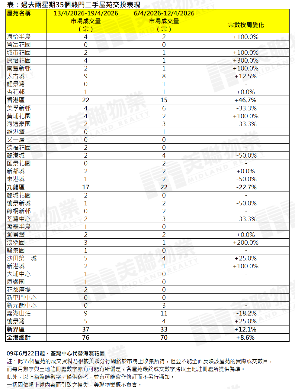 过去一周交投气氛继续向好,新盘热销,二手交投亦平稳向上。综合美联分行资料,全港35个大型屋苑过去一周(4月13日至4月19日)合共录得76宗成交,较前一周(4月6日至4月12日)的70宗按周增加约8.6%,连升两周。上周成交量不单较本年迄今平均约73宗高出约4.1%,并较去年全年平均约65宗上升约16.9%(见图)。