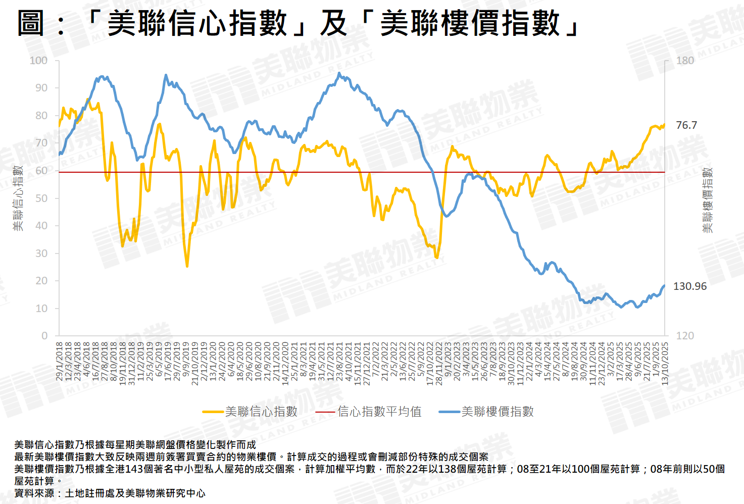 「美聯信心指數」(MCI)是根據美聯物業網上搵樓的網盤價格變化製作而成,於每個星期一公佈,從網盤的價格轉變,反映業主的放盤態度,以作為未來樓價走勢指標。指數上升代表減價盤減少,樓價上升機會增;指數下跌代表減價盤增加,樓價下跌機會大。信心指數走勢是徘徊於0至100之間,100點表示放盤業主全面看好,0點則表示放盤業主全面看淡,「信心指數平均值」則是此指數由2018年初至今的平均值,屬睇好或睇淡後市的分界線。當「美聯信心指數」(MCI)跌穿此指數的平均值時,表示樓價有機會由升轉跌或跌勢加快。當「美聯信心指數」(MCI)升穿此指數的平均值時,表示樓價有機會由跌轉升或升勢加快。指數的升跌幅並非直接反映樓價升跌幅,但從指數走勢可推測4星期或之後樓價向上或向下的趨勢。