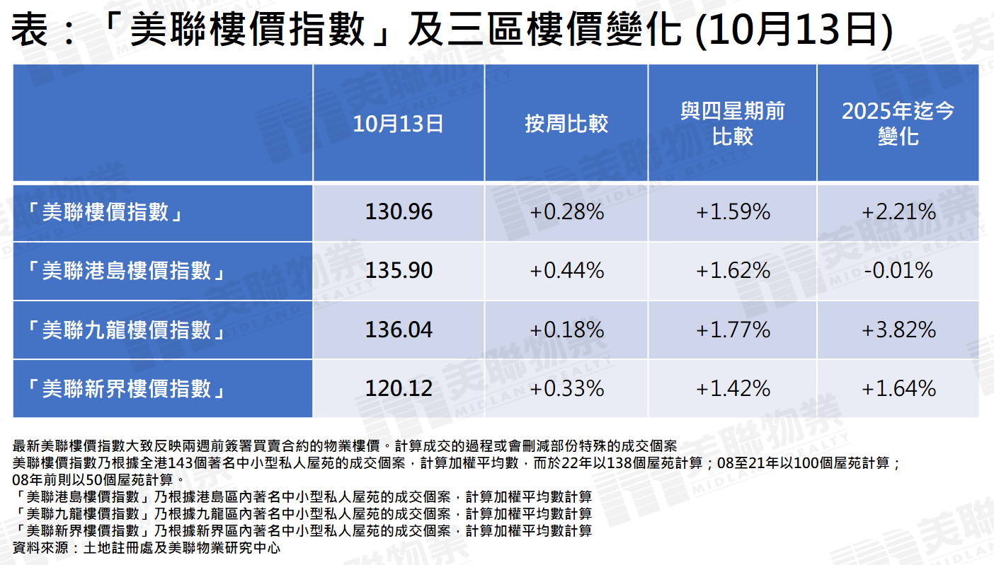 樓價持續向上,「美聯樓價指數」連升5周,最新報130.96點,按周升0.28%,本年迄今累計升幅進一步擴大至2.21%,樓價指數逼近131點,創自去年8月中後的逾1年新高。值得留意,最新一周樓價指數已經初步反映9月中旬美國重啟減息以及《施政報告》的疊加效應。