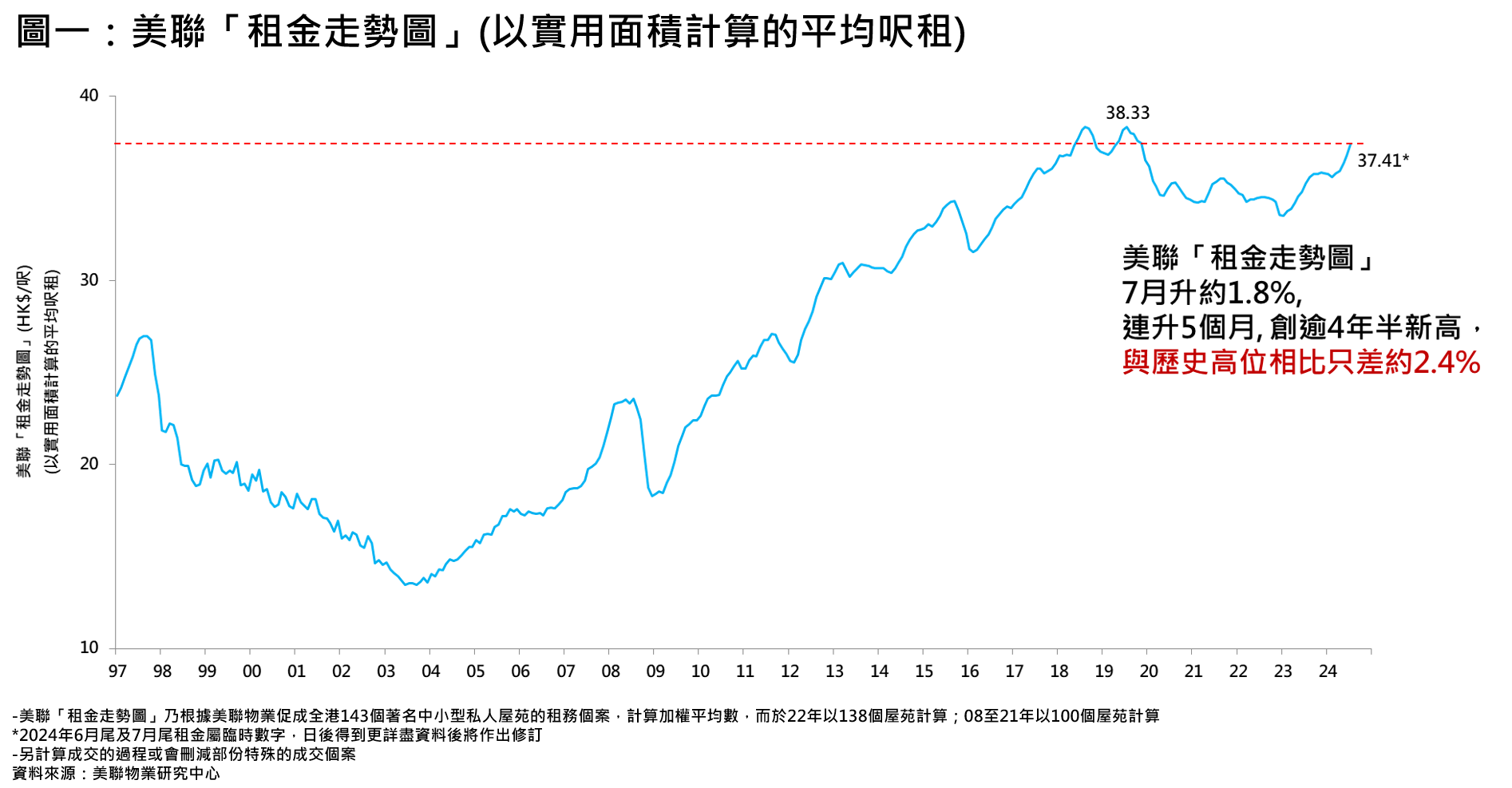 踏入傳統租務旺季,不少來港升學的內地生租樓,加上外來專才來港工作居住,帶動私人住宅租金進一步攀升。美聯「租金走勢圖」7月份以實用面積計算的私人住宅平均呎租報約37.41元,按月升約1.8%,連升5個月,並創自2019年11月後的56個月(即超過4年半)新高,而目前租金與2019年7月份錄得約38.33元的歷史高位比較,僅相距約2.4%(見圖一)。