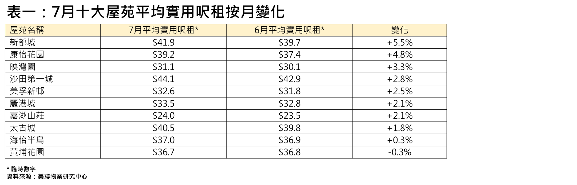 十大屋苑7月呎租「9升1跌」