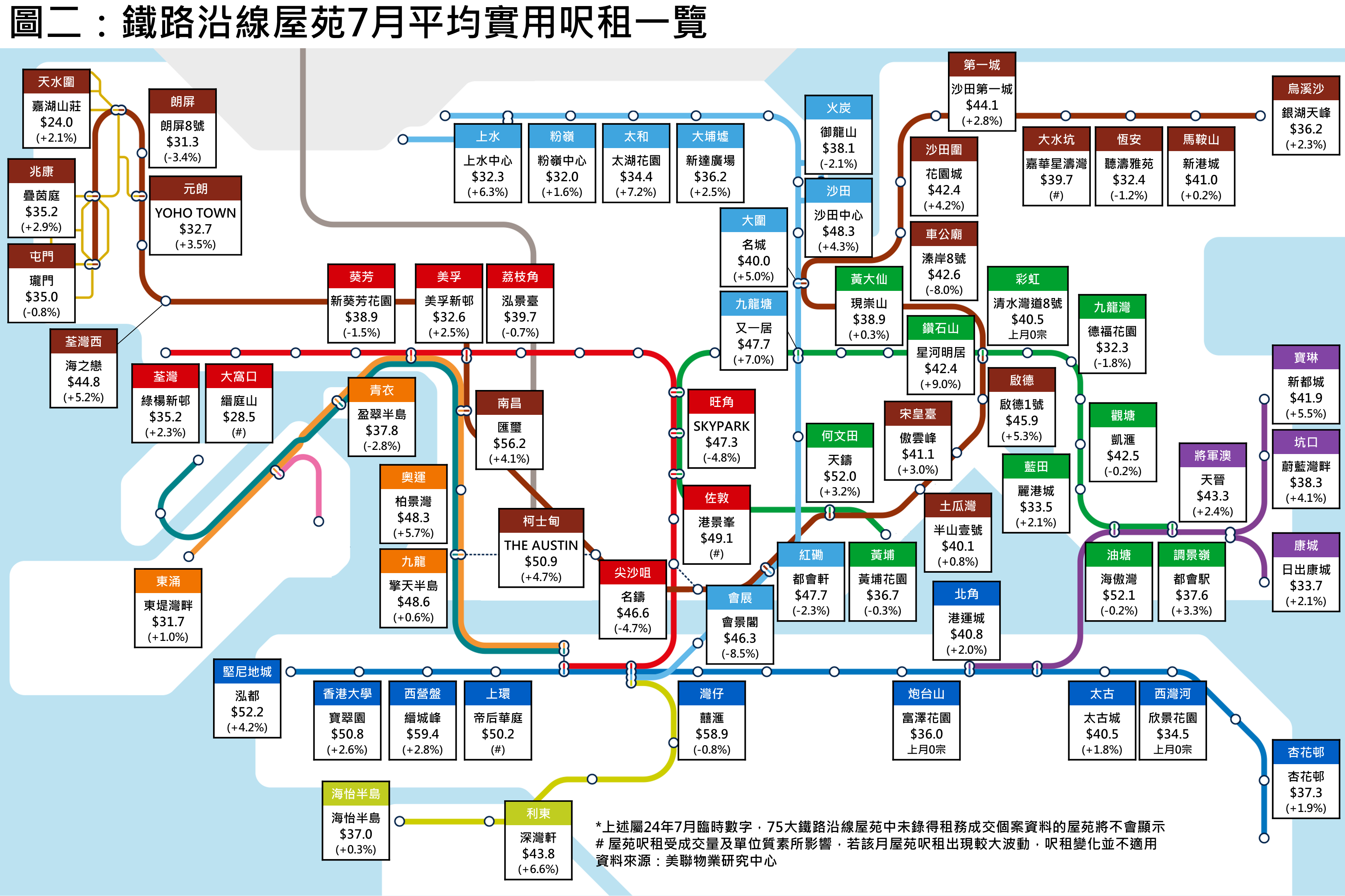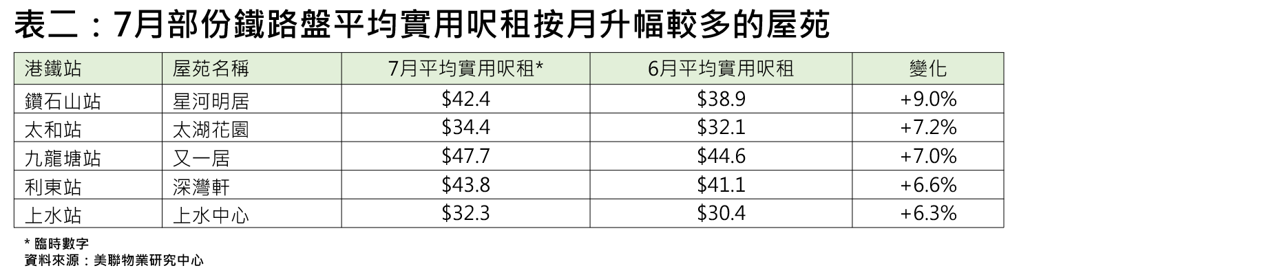 鐵路盤方面,部份鐵路沿線屋苑7月份的呎租升幅表現突出,當中鑽石山站星河明居按月升約9%,太和站太湖花園及九龍塘站又一居按月分別升約7.2%及約7%;利東站深灣軒及上水站上水中心的呎租亦分別錄得約6.6%及約6.3%的升幅(見表二)。