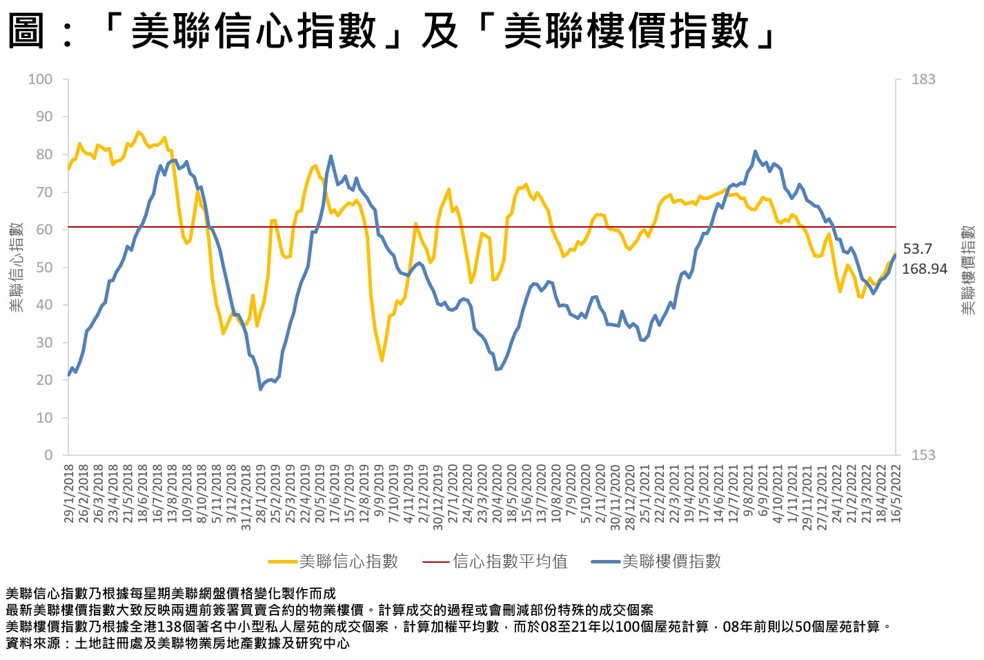 「美聯信心指數」(MCI)是根據美聯物業網上搵樓的網盤價格變化製作而成,於每個星期一公佈,從網盤的價格轉變,反映業主的放盤態度,以作為未來樓價走勢指標。指數上升代表減價盤減少,樓價上升機會增;指數下跌代表減價盤增加,樓價下跌機會大。信心指數走勢是徘徊於0至100之間,100點表示放盤業主全面看好,0點則表示放盤業主全面看淡,「信心指數平均值」則是此指數由2018年初至今的平均值,屬睇好或睇淡後市的分界線。當「美聯信心指數」(MCI)跌穿此指數的平均值時,表示樓價有機會由升轉跌或跌勢加快。當「美聯信心指數」(MCI)升穿此指數的平均值時,表示樓價有機會由跌轉升或升勢加快。指數的升跌幅並非直接反映樓價升跌幅,但從指數走勢可推測4星期或之後樓價向上或向下的趨勢。