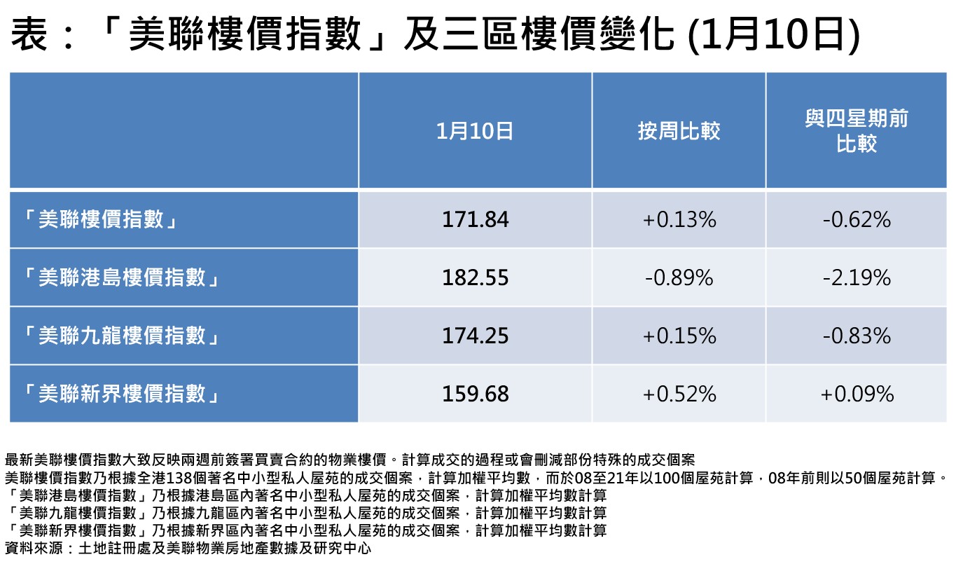 若以3區劃分,港島樓價連跌8周。「美聯港島樓價指數」最新報182.55點,按周跌0.89%;比起四星期前更跌2.19%(見表)。