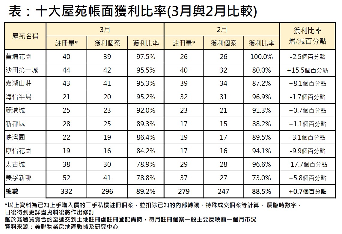 樓價上升,帶動帳面獲利比率向上。據美聯物業房地產數據及研究中心綜合土地註冊處資料顯示,根據已知上手購入價的註冊個案,扣除已知內部轉讓、特殊成交個案等計算,3月份十大屋苑帳面獲利比率達89.2%,較2月份88.5%增加0.7個百分點(見表)。