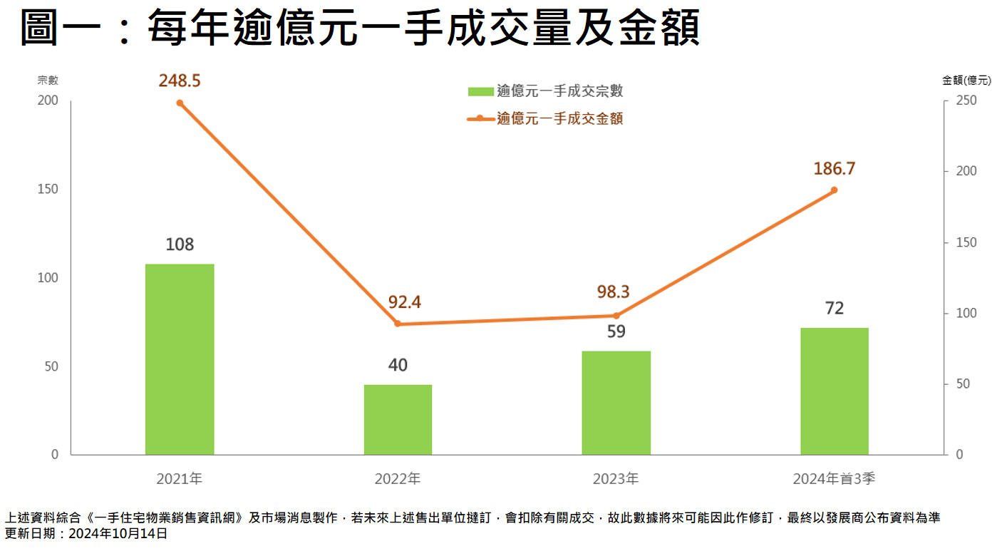 今年一手超級豪宅市場表現突出。據美聯物業研究中心綜合<<一手住宅物業銷售資訊網>>資料及市場消息,今年首3季逾億元一手豪宅成交量錄72宗,已經較去年全年59宗高出約22%,涉及金額高達約186.7億元,則較去年全年約98.3億元大幅高出約9成,同創3年新高(見圖一);值得留意,金額升幅急勁,主要是因為今年首3季已錄9宗6億元或以上超大額成交,其中3宗更達10億元或以上;反觀,去年最高的一手成交金額不足6億元。今年在超大額成交帶動下,升幅顯著。