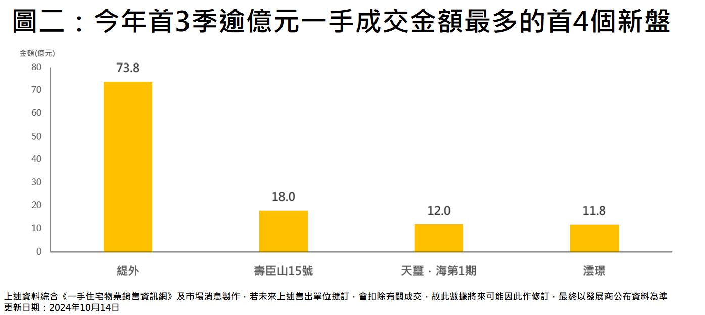 若以新盤劃分,今年首3季逾億元一手豪宅涉及約186.7億元中,單計算位處九龍半山的超級豪宅緹外,已涉及約73.8億元,即佔期內約39.5%,主要因該新盤年內錄2宗10億元或上個案;緊隨其後的是南區壽臣山15號、啟德天璽.海第1期及同區澐璟,分別錄約18億元、約12億元及約11.8億元(見圖二),這4大樓盤的成交金額已佔整體逾億元一手成交金額超過6成。