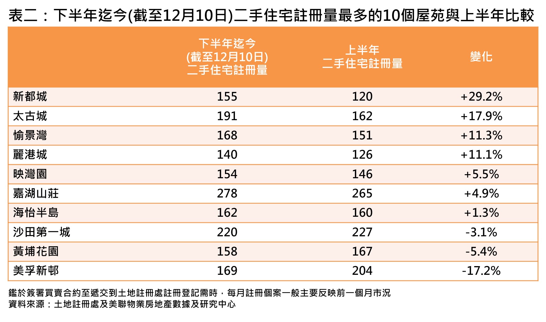 若以屋苑劃分,下半年迄今(截至12月10日)二手住宅註冊量最多的10個屋苑中,7個已超越上半年,當中新都城升幅最多,升約29.2%;太古城、愉景灣及麗港城均高出超過一成;映灣園、嘉湖山莊與海怡半島則升約1.3%至約5.5%;反觀,餘下3個尚未超越上半年的屋苑中,沙田第一城與黃埔花園分別少約3.1%及約5.4%,而美孚新邨差距最大,少約17.2%(見表二)。