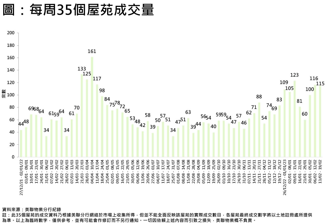綜合美聯分行資料,全港35個大型屋苑過去一周(2月13日至2月19日)合共錄115宗成交,較前一周(2月6日至2月12日)的116宗輕微減少1宗或跌約0.9%;受惠通關效應,本港經濟逐步復常,樓市氣氛持續向好,令35屋苑二手交投連續3周企穩逾百宗。事實上,近8個星期除了有2周受農曆新年長假期影響之外,其餘6周全數錄得100宗或以上交投,足見二手交投表現理想(見圖)。