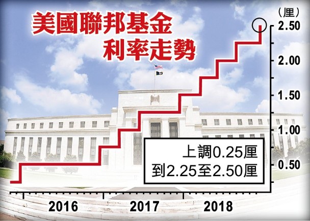 美國聯儲局未有理會總統特朗普的反對,於香港時間周四凌晨3時宣布,把聯邦基金利率上調0.25厘,至介乎2.25厘至2.5厘,符合大部分市場預期,亦是今次加息周期第9度上調利率。雖然聯儲局維持「進一步漸進加息」的前瞻前引,但最新利率預測顯示,官員料2019年的加息次數,由9月時估計3次,降至兩次,暗示未來加息步伐將放慢。