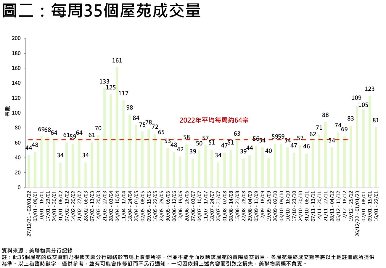 若以按周計算,受農曆新年假期影響,上周35屋苑宗數較前一周(1月9日至1月15日)123宗減少約34.1%;惟較去年平均每周約64宗仍高出約26.6%,表現仍然理想(見圖二)。