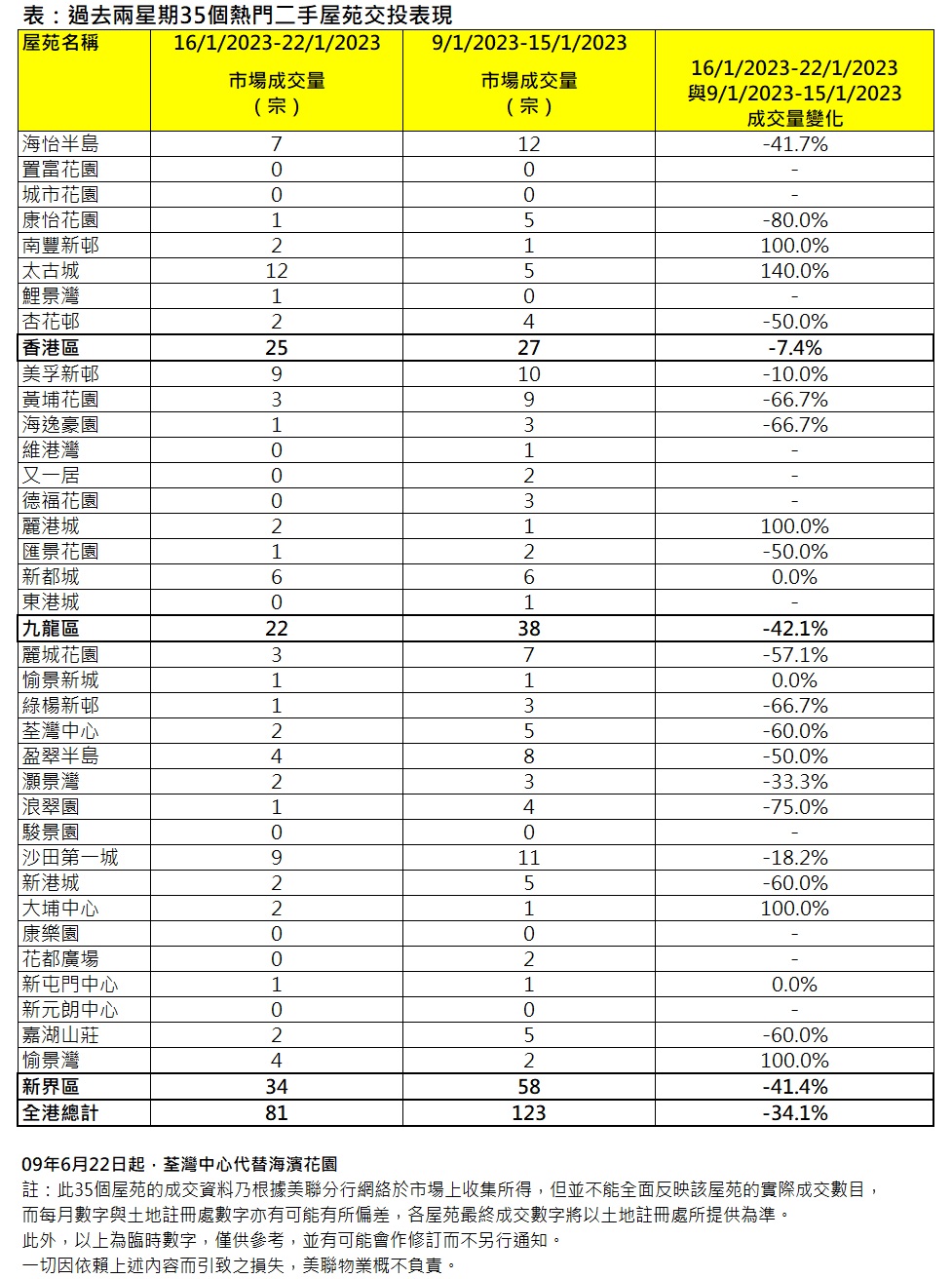 新界區方面,區內17屋苑上周錄34宗,按周亦下跌約41.4%。當中麗城花園及盈翠半島齊減4宗,荃灣中心、浪翠園、新港城及嘉湖山莊同減3宗,綠楊新邨、沙田第一城及花都廣場各減2宗,灝景灣減少1宗;而區內只得愉景灣及大埔中心分別增加2宗及1宗,難阻新界區上周交投大減(見表)。