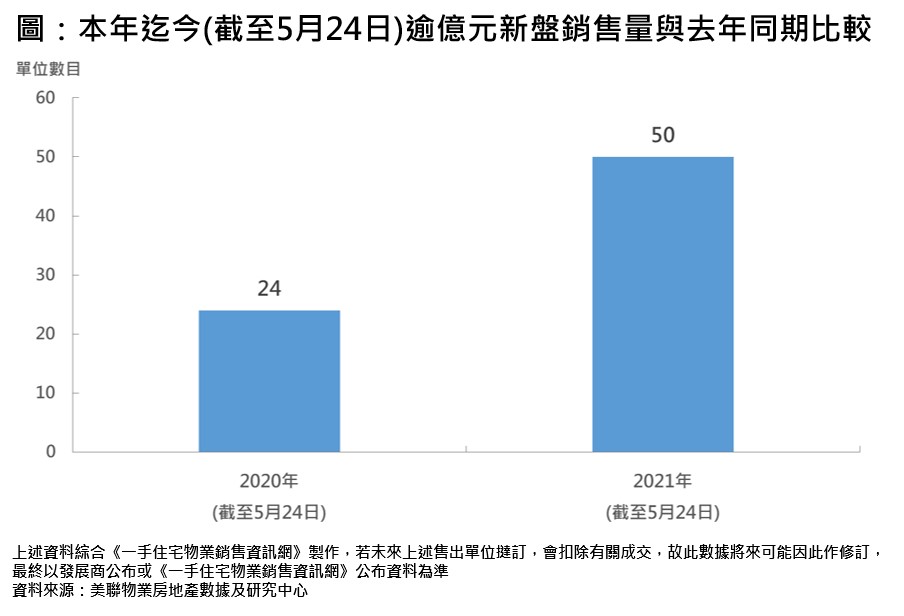 據美聯物業房地產數據及研究中心綜合<<一手住宅物業銷售資訊網>>資料顯示,本年迄今(截至5月24日)新盤共售出近6,500個單位,比起去年同期(2020年截至5月24日)約4,600多個按年上升約4成。當中逾億元交投更為突出,本年迄今售出約50個單位,較去年同期約24個增加1.08倍(見圖)。逾億元新盤交投急升,其中原因與年內有不少超級豪宅登場有關,與此同時,疫情緩和,市場憧憬通關,入市步伐加快,亦是另一原因。
