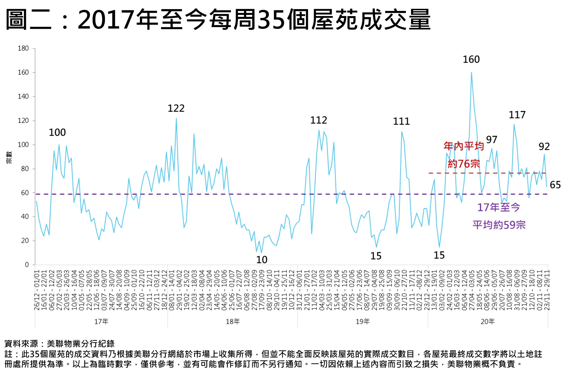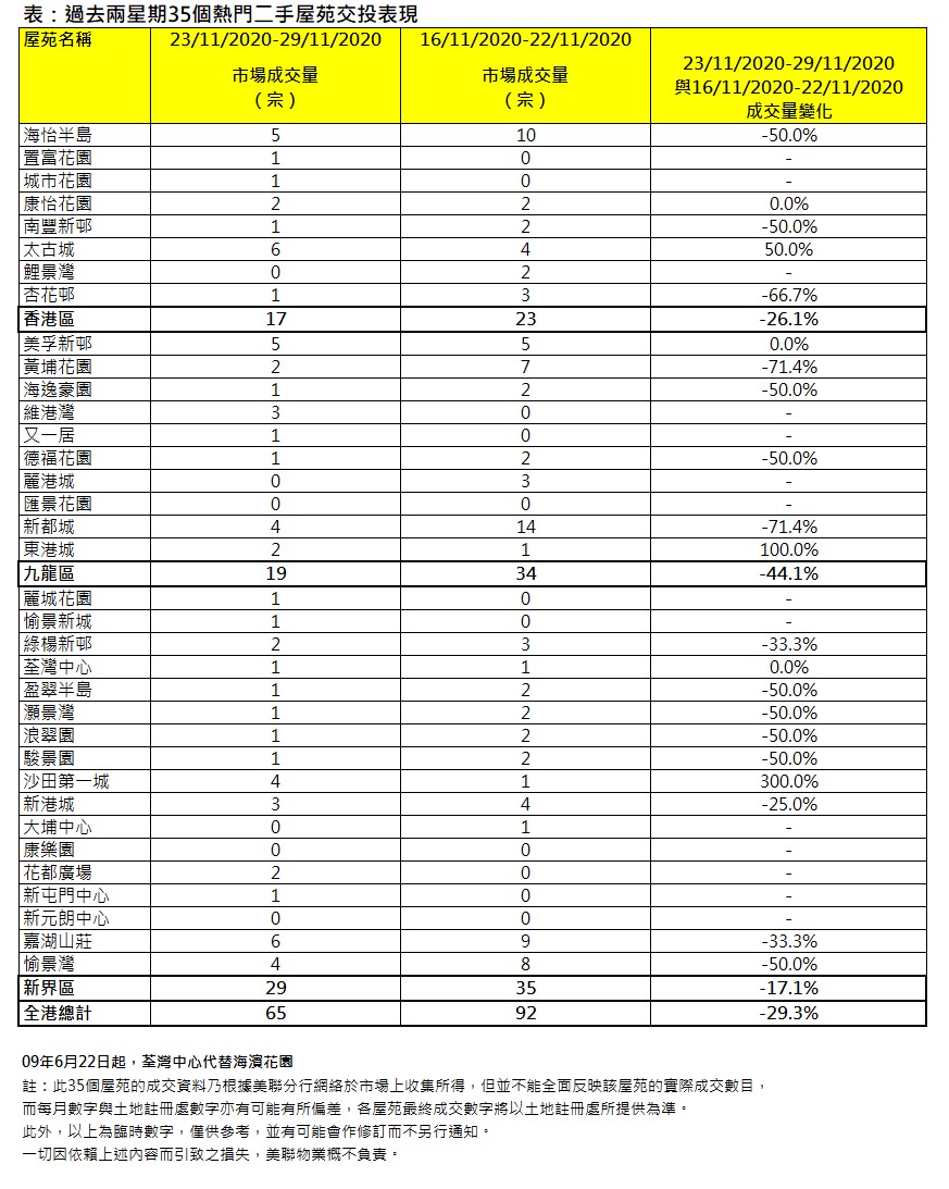 綜合美聯分行資料,過去一周(11月23日至11月29日)全港35個大型屋苑合共錄65宗成交,較前一周(11月16日至11月22日)92宗按周回落約29.3%,創7星期新低,比起本年迄今的平均約76宗低約14.5%(見圖一)。
