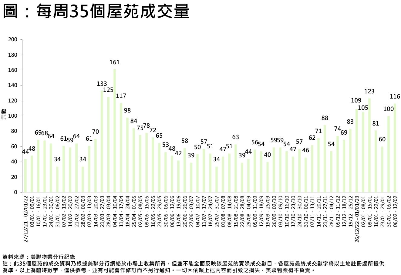 受全面通關效應帶動,加上市場預期息口今年有望見頂等利好消息,準買家積極入市,二手交投持續活躍。綜合美聯分行資料,全港35個大型屋苑過去一周(2月6日至2月12日)合共錄116宗成交,較前一周(1月30日至2月5日)的100宗上升16%,連續2周企穩逾百宗,更創接近十個月以來次高水平(見圖)。