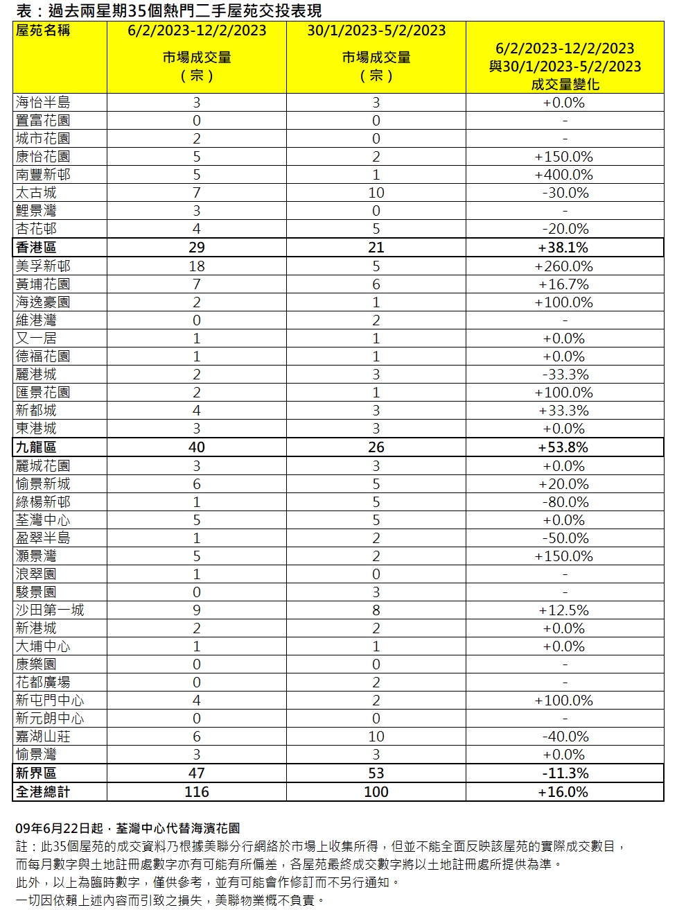 若將35屋苑按三區劃分,九龍區升幅最大。區內10屋苑上周錄40宗,按周上升約53.8%。當中美孚新邨表現優異,按周增加13宗,黃埔花園、海逸豪園、匯景花園及新都城齊增1宗;縱使維港灣及麗港城分別減少2宗及1宗,九龍區上周交投依然大增(見表)。