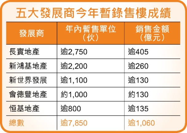 本港樓價指數屢創新高,二手市場在辣招打壓下,盤源短缺問題持續,加上發展商積極推出高成數按揭搶客,樓市購買力不斷流入新盤市場。據一手銷售資訊網資料,年初至今僅約8個月,五大主要發展商售樓量已較去年全年多出約百伙,當中以長實地產(01113)及新鴻基地產(00016)最突出,期內分別售出逾2,750及逾2,200伙。