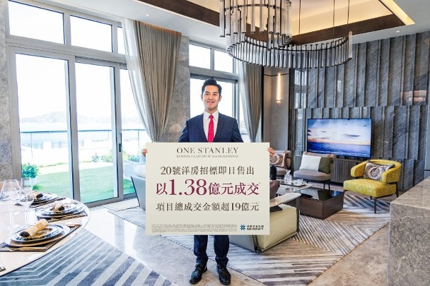 建灝地產旗下港島南區赤柱黃麻角道ONE STANLEY,周二(1日)以招標形式售出項目20號洋房,連兩個車位以1.38億港元成交,呎價約39,988元。
