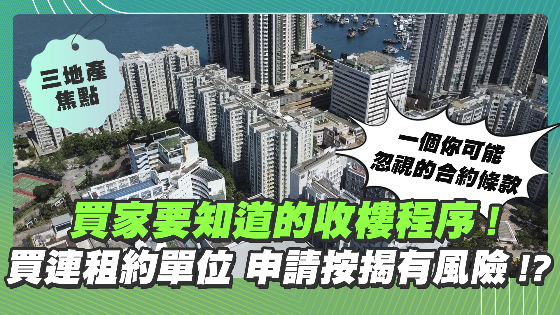 不過除「交吉」外,還有一些二手樓是連租約成交的。連租約是指物業現時仍有租客租住,未必可以安排睇樓,有機會簽署買賣合約時,買家都未能了解單位室內的真實狀況,因此會有較大的風險。