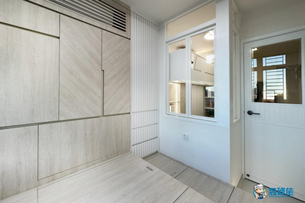 這組與地台床架一體成型的床頭櫃,以「垂直收納」破解床頭擁擠感:橫向展開的波浪紋門板暗藏收納空間,旁邊的白色衣櫃底部,加裝活動式床頭櫃,需要時可拉出放置手機等小物,增加使用便利性又不失衣櫃的連貫感。連接客廳的白框小窗戶更能將光線引進睡房,提升採光度兼增強全屋設計的一體性。
