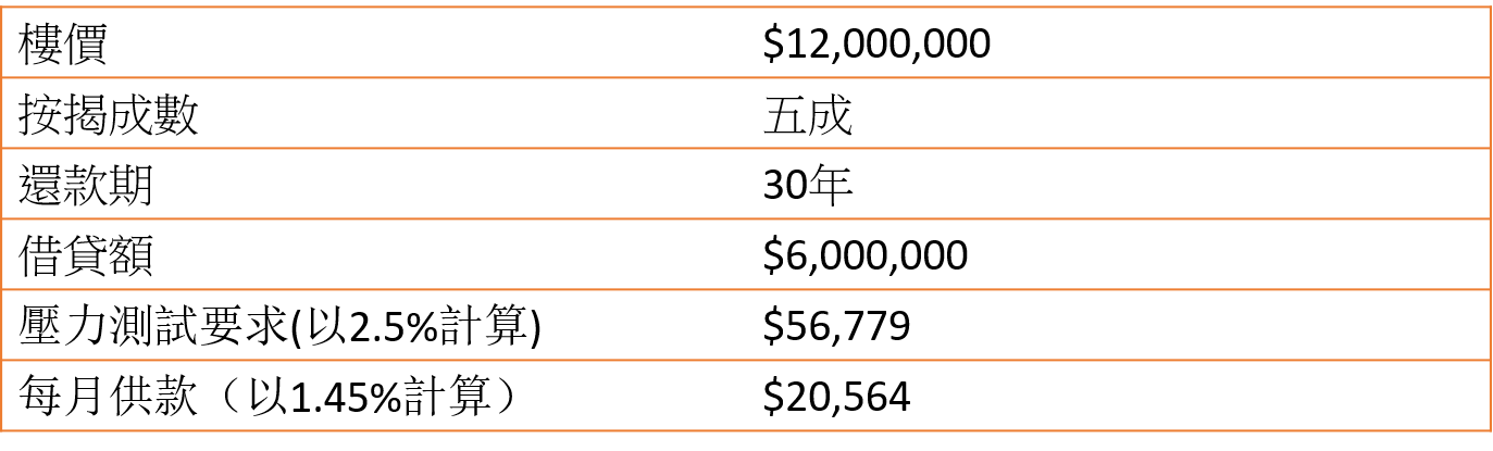 陳先生打算買入樓價為$1,200萬的物業,他本身已經沒有按揭在身,信貸評級良好,由於借貸額達600萬,他可以獲得H+1.3% 按揭計劃(封頂息率為2.5%),選擇還款期30年,以近日按息計算,其壓測要求為$56,779,在低息環境下,實際按息低至1.45%,每月供款為$20,564。