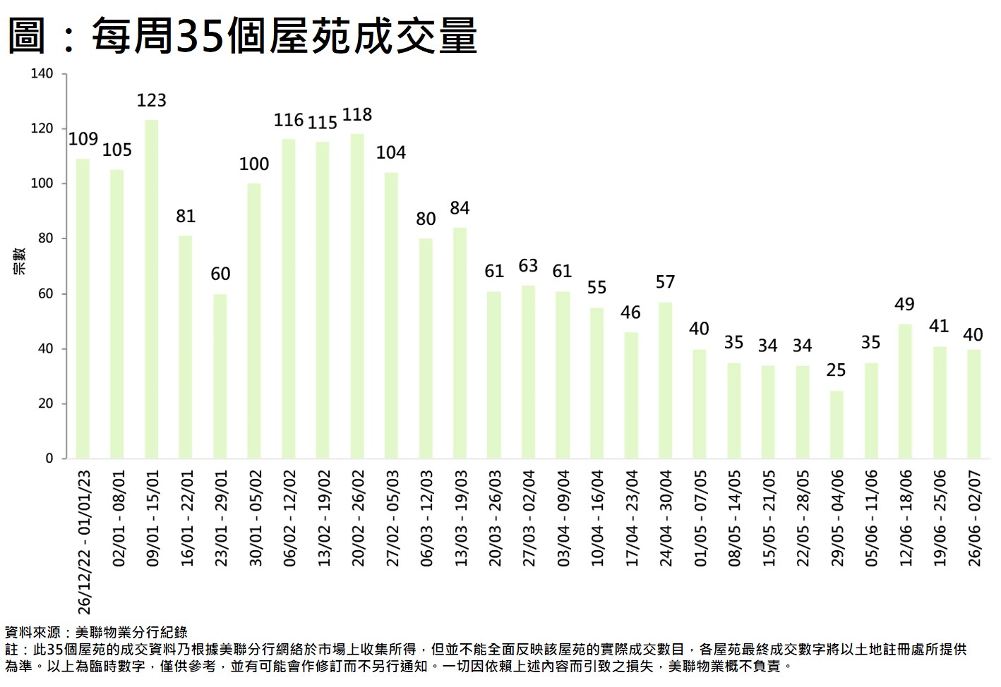 啟德新盤上周末開售,銷情理想,搶去市場注意力,二手物業交投繼續受壓。綜合美聯分行資料,全港35個大型屋苑過去一周(6月26日至7月2日)合共錄40宗成交,較前一周(6月19日至6月25日)的41宗按周輕微減少1宗,下跌約2.4%(見圖)。