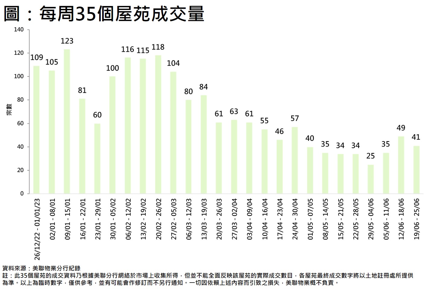美國息口走勢未明朗下,加上內地提振經濟措施力度低於市場預期,拖累上星期恒生指數累積下跌超過1,100點,樓市氣氛亦受影響。綜合美聯分行資料,全港35個大型屋苑過去一周(6月19日至6月25日)合共錄41宗成交,較前一周(6月12日至6月18日)的49宗按周下跌約16.3%,但仍創近8周的次高(見圖)。