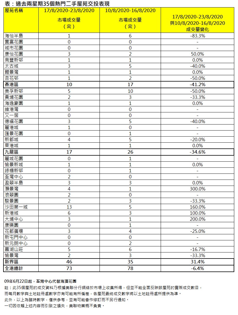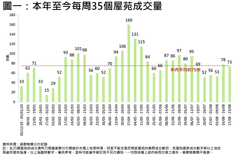 隨著本港確診數字回落,加上減價盤增,上周35屋苑交投持續穩企逾70宗水平。綜合美聯分行資料,過去一周(8月17日至8月23日)全港35個大型屋苑共錄73宗成交,雖然較前一周(8月10日至8月16日)78宗按周跌約6.4%,但已連續兩星期穩企逾70宗水平,並創6星期次高(見圖一)。