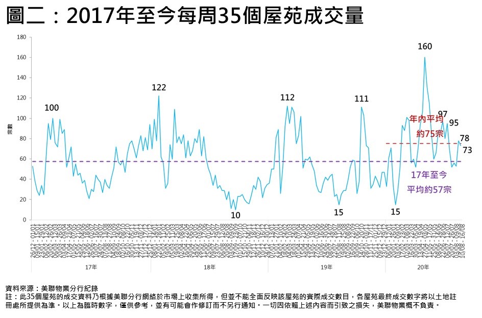 上周35屋苑交投錄73宗,與本年迄今平均約75宗相比,僅微跌約2.7%。若與2017年至今平均約57宗比較,仍高出約28.1%(見圖二)。