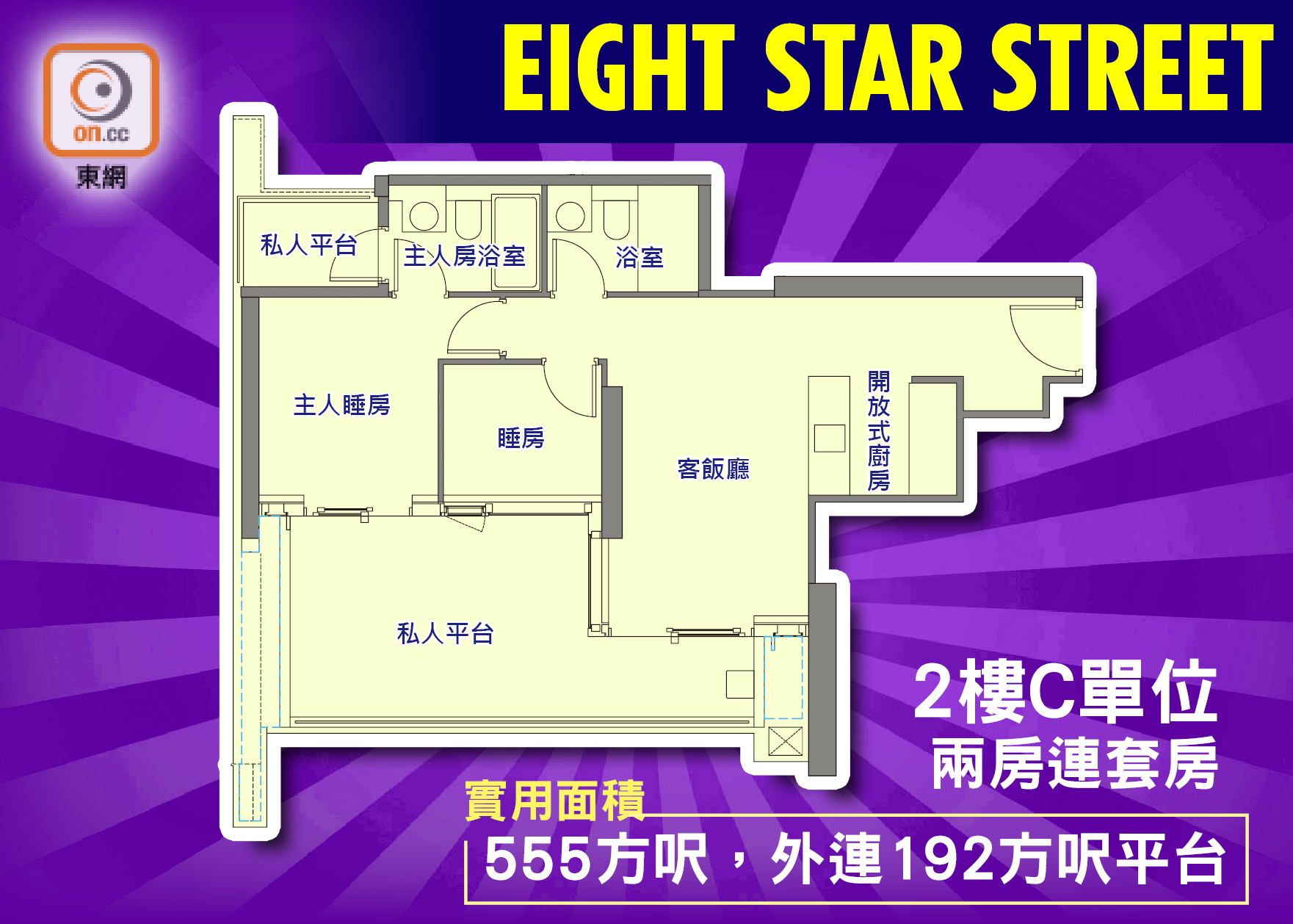 由太古地產(01972)發展的EIGHT STAR STREET正坐落這個充滿活力的星街小區上;樓盤一共提供37伙,間隔涵蓋一房至三房,實用面積由約431至1,198方呎。