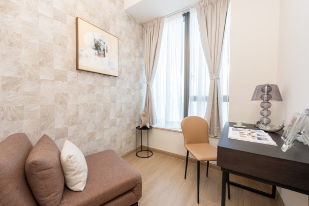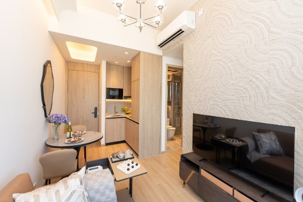 發展商最新開放的現樓示範單位包括第1A座26樓C室,實用面積387方呎,採兩房連開放式廚房間隔。單位間隔方正,層與層之間的高度有約3.5米,擺放家具及掛上吊燈,室內設計配合全落地玻璃窗,增加全屋的採光度,營造出溫暖而舒適的氛圍。