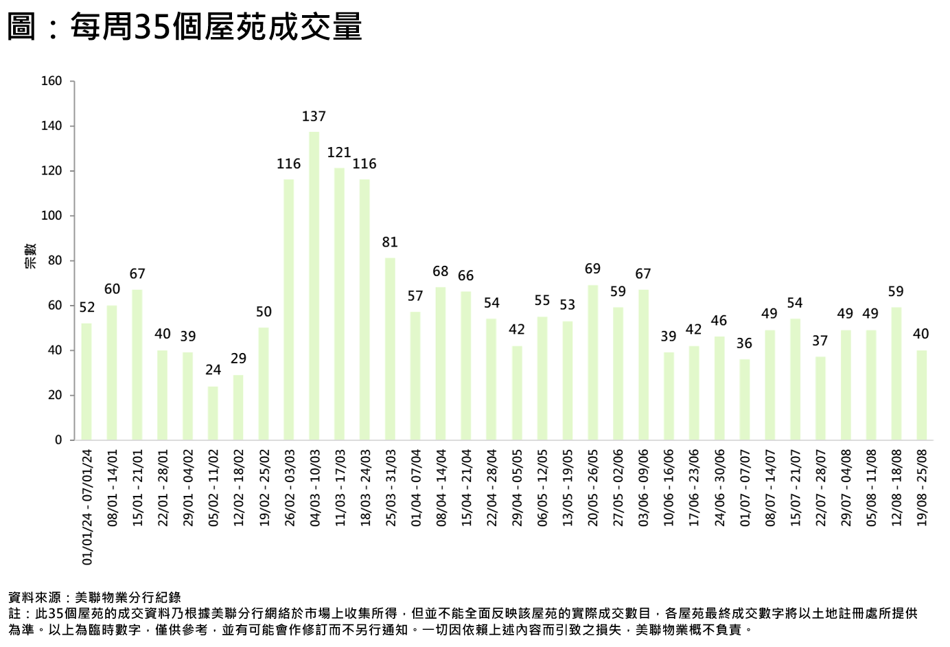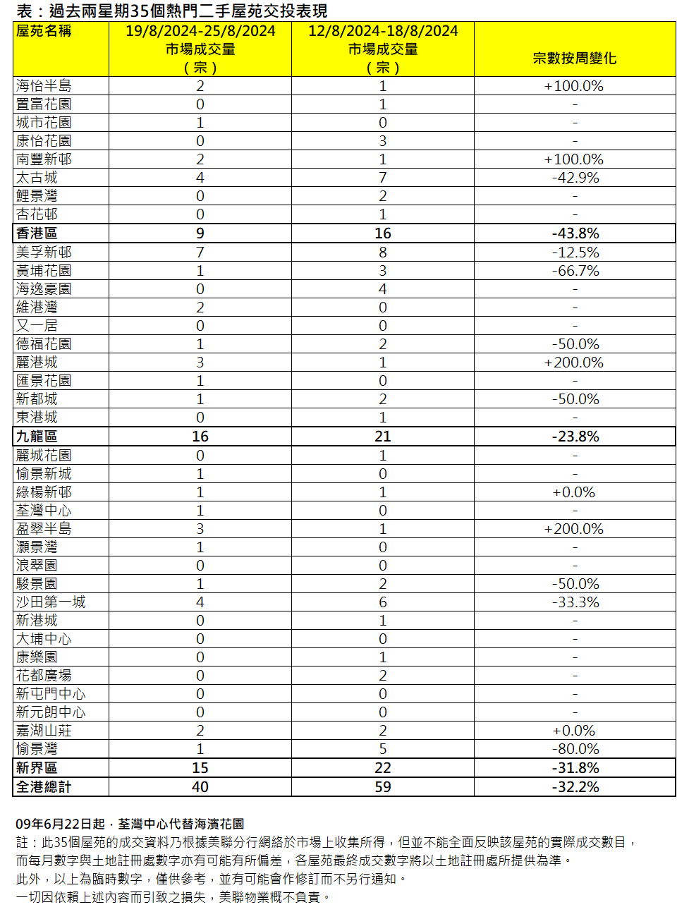上周末港島區有全新盤開售,銷情理想,搶去部份購買力;另外市場靜候美國9月落實減息,買家觀望氣氛濃厚,上周二手成交減少。綜合美聯分行資料顯示,全港35個大型屋苑過去一周(8月19日至8月25日)合共錄40宗成交,較前一周(8月12日至8月18日)的59宗按周回落約32.2%,創四周新低(見圖)。