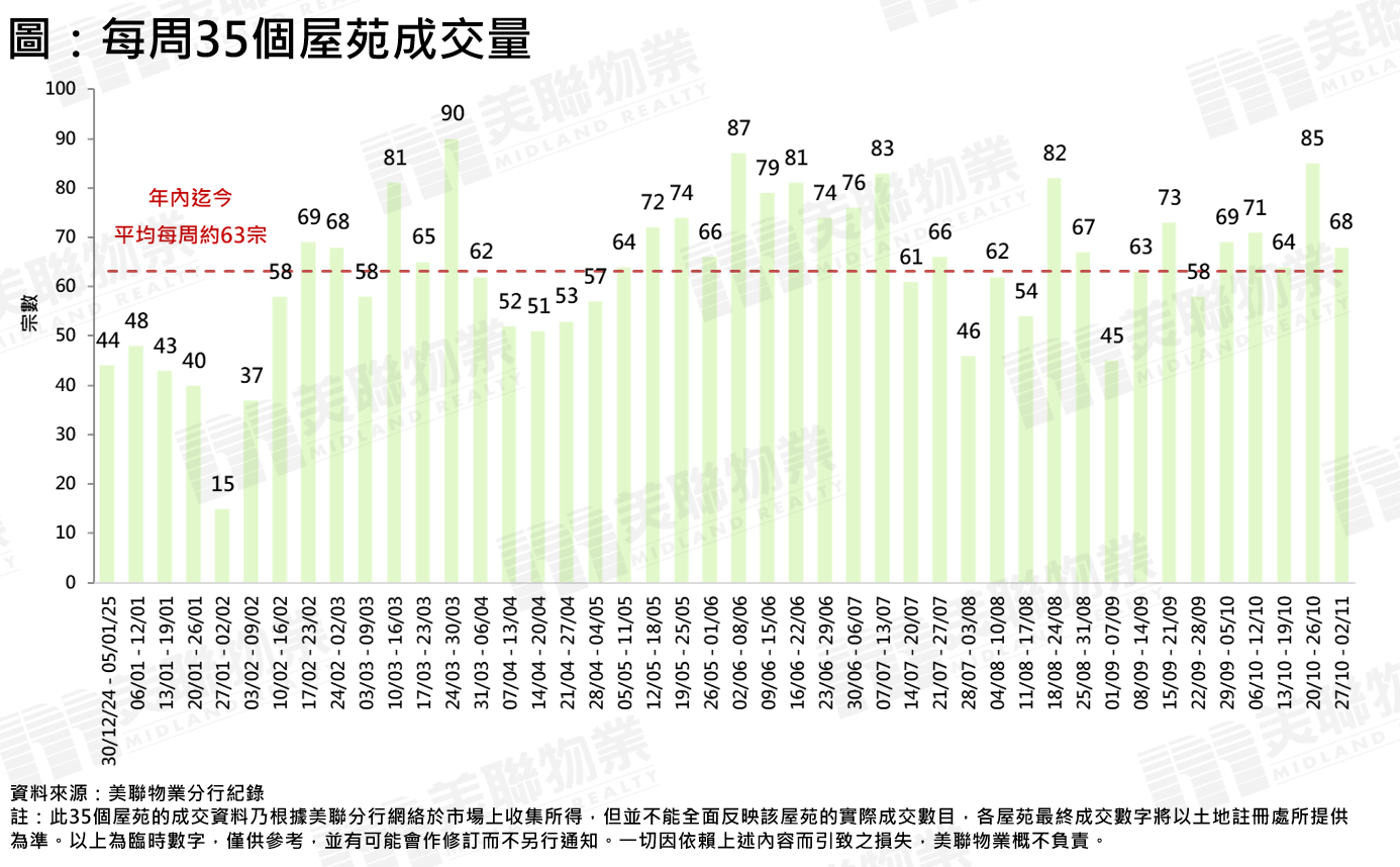 由於新盤市場搶佔焦點,在剛過去周末推售的港島灣仔區全新盤首批單位更即日售罄,加上不少筍盤早前已被消化,二手交投按周高位回落。綜合美聯分行資料顯示,全港35個大型屋苑過去一周(10月27日至11月2日)合共錄68宗成交,較前一周(10月20日至10月26日)的85宗按周回落約20%,但比起本年迄今平均每周約63宗仍高約8%(見圖)。