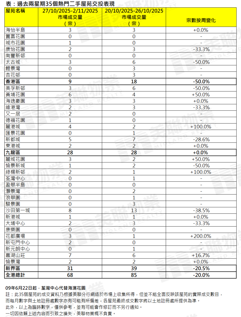 若將35屋苑按三區劃分,港島區宗數跌幅最大,區內8個屋苑上周錄得9宗成交,按周減少約50%。當中太古城、鯉景灣及杏花邨齊減3宗,康怡花園減1宗;區內只有城市花園增加1宗之下,上周港島區交投明顯回落(見表)。