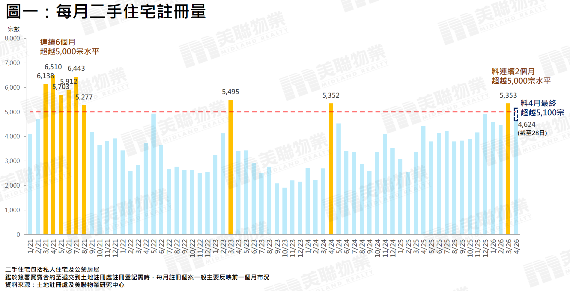 隨著4月二手註冊量料突破5,100宗,屆時將連續兩個月超越5,000宗水平,為2021年8月(即逾4年半)以來首見,反映二手住宅市場交投氣氛持續暢旺(見圖一)。