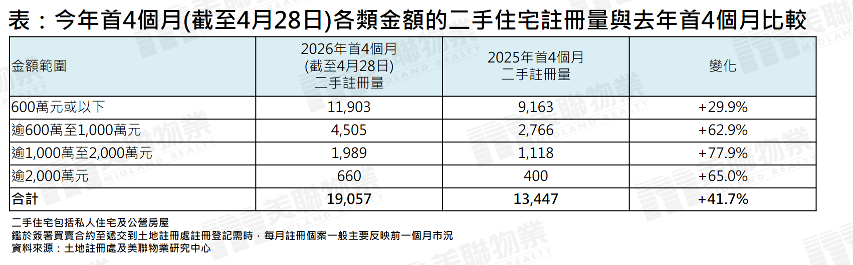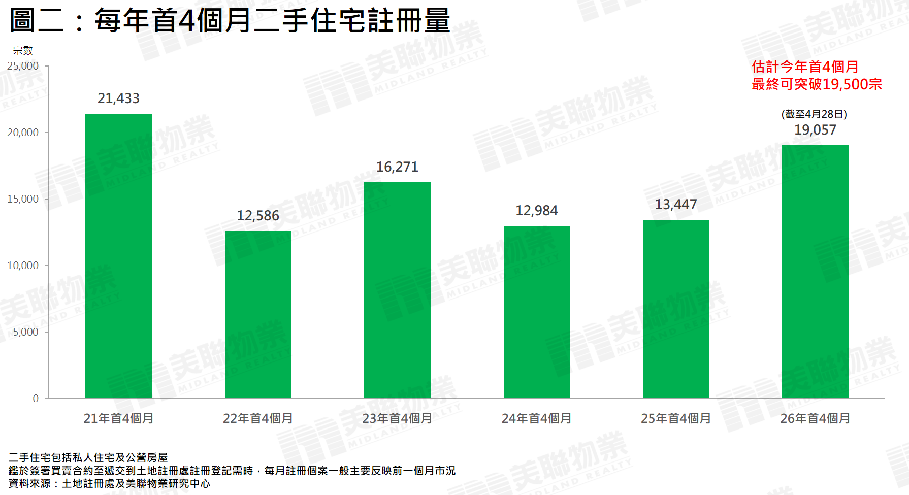 在過去2個月二手住宅註冊宗數理想的帶動下,今年首4個月(截至4月28日)宗數已達19,057宗,比起去年首4個月的13,447宗按年大幅高出約41.7%,並創5年同期新高,並預計今年首4個月最終可進一步突破19,500宗(見圖二)。