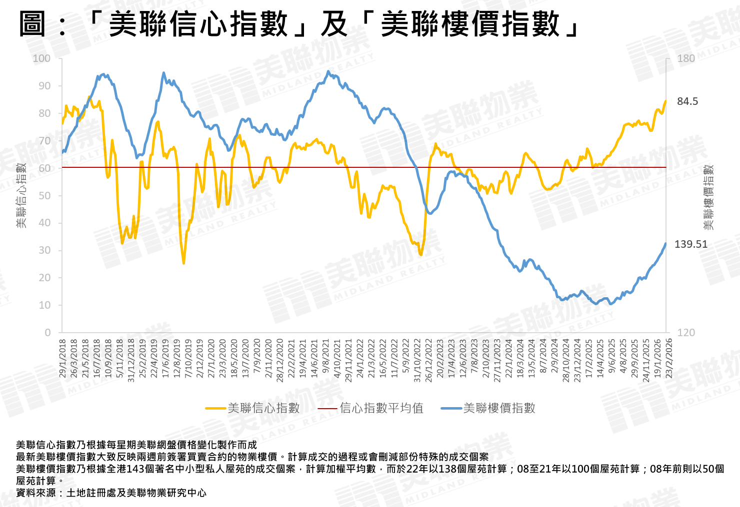 「美聯信心指數」(MCI)是根據美聯物業網上搵樓的網盤價格變化製作而成,於每個星期一公佈,從網盤的價格轉變,反映業主的放盤態度,以作為未來樓價走勢指標。指數上升代表減價盤減少,樓價上升機會增;指數下跌代表減價盤增加,樓價下跌機會大。信心指數走勢是徘徊於0至100之間,100點表示放盤業主全面看好,0點則表示放盤業主全面看淡,「信心指數平均值」則是此指數由2018年初至今的平均值,屬睇好或睇淡後市的分界線。當「美聯信心指數」(MCI)跌穿此指數的平均值時,表示樓價有機會由升轉跌或跌勢加快。當「美聯信心指數」(MCI)升穿此指數的平均值時,表示樓價有機會由跌轉升或升勢加快。指數的升跌幅並非直接反映樓價升跌幅,但從指數走勢可推測4星期或之後樓價向上或向下的趨勢。