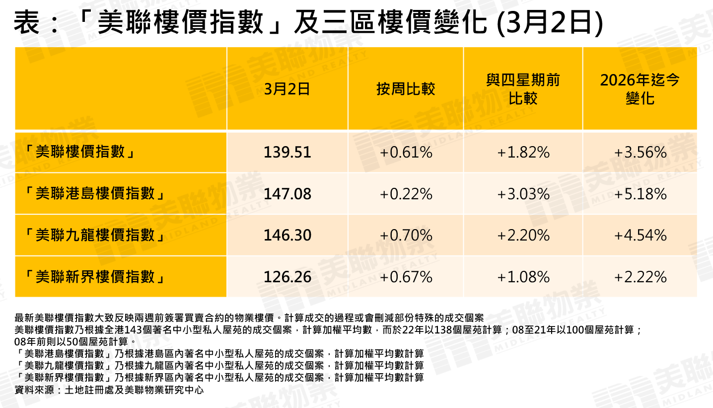 若按3區劃分,3區樓價連續2星期按周全線上升。「美聯港島樓價指數」最新報147.08點,按周升0.22%;「美聯九龍樓價指數」最新報146.3點,按周升0.7%;「美聯新界樓價指數」最新報126.26點,按周升0.67%;若與四星期前相比,3區樓價均全線上升,港島區、九龍區及新界區較四星期前分別升3.03%、2.2%及1.08%;至於年內迄今樓價變化,3區樓價同樣全面向上,港島區、九龍區及新界區年內迄今分別升5.18%、4.54%及2.22%(見表)。
