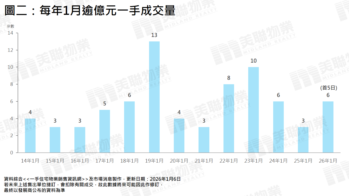 踏入2026年,相信樓市旺勢延續,西沙大型新盤收票反應熱烈,加上月內有其他全新盤部署登場,連同熱賣貨尾盤持續銷售,估計今年1月一手成交量有望突破2,000宗,屆時將會連續12個月錄逾千宗,續創2013年一手銷售條例後最長紀錄。以每年1月計算,宗數將打破過去4年同期不足千宗的情況,更將創自2013年一手銷售條例後最旺的1月份(見圖一)。