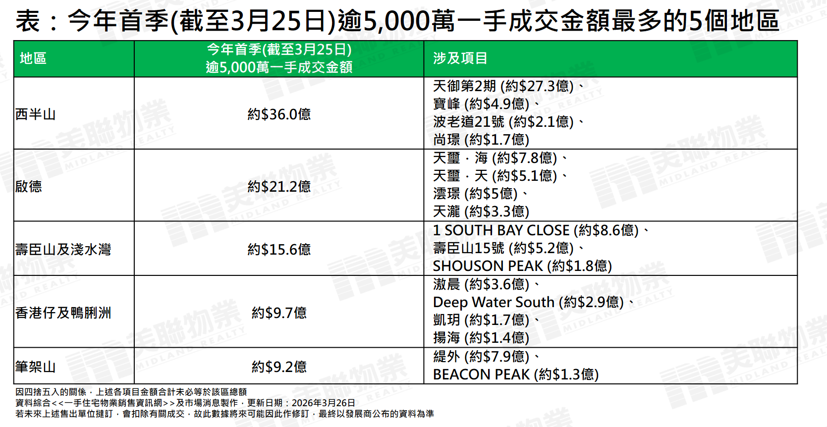 若以今年首季(截至3月25日)逾5,000萬元一手成交金額約126.2億元劃分,以西半山最吸金,錄約36億元。其中天御第2期表現最亮麗,單一項目錄約27.3億元(見表),不僅為西半山之冠,亦榮登全港豪宅新盤「吸金王」。
