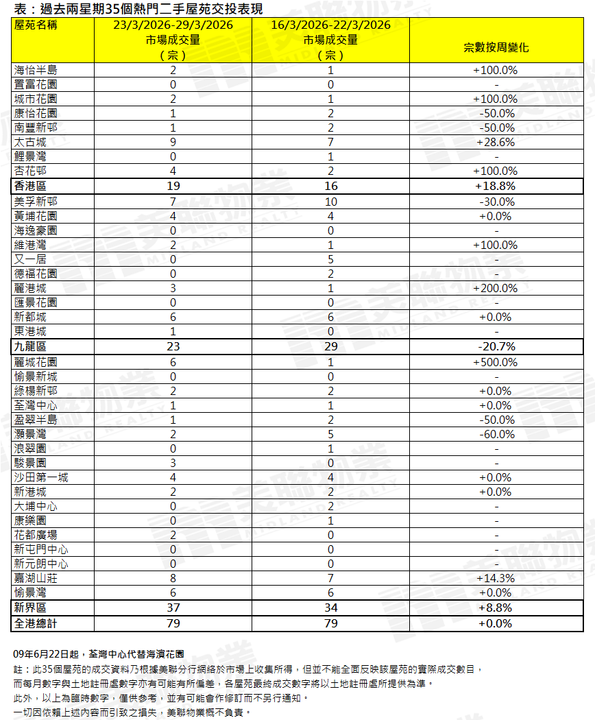 若以過去一周計算,樓市交投保持暢旺,多個新盤接連推售,帶動過去一周一手市場錄得逾600宗成交,按周增加約兩成半;同一時間,二手交投亦持續活躍。據資料顯示,上周35個屋苑共錄79宗成交,宗數與前一周(3月16日至3月22日)的79宗維持不變(見圖)。