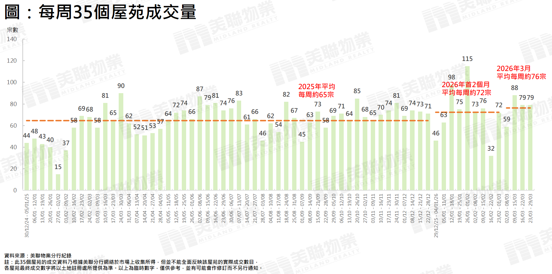 受中東局勢影響,近期股市波動,然而過去一個月二手交投仍平穩向上。綜合美聯分行資料顯示,3月份4星期(3月2日至3月29日)全港35個大型屋苑合共錄305宗成交,即平均每周錄約76宗,較今年首2個月平均每周錄約72宗高出逾5%,比起去年平均每周約65宗更增加約17%(見圖)。