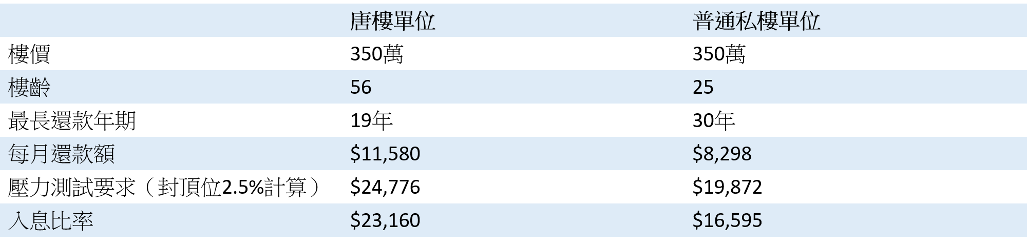基本上唐樓可以做到高達九成按揭,但由於一般銀行以「75減」計算最長按揭還款年期,唐樓樓齡一般高達五、六十年,借款人的每月還款額便要增加。例如黃埔寶利唐樓樓齡已屆56年,現時放盤價為350萬,以銀行「75減」計算後,最長按揭還款期只有19年,與同一個普通私樓比較,唐樓的每月還款額為$11,580,普通私樓單位則為$8,298,相差$3,282。除了每月還款額會增加,壓力測試要求也會有所變化。唐樓單位要求申請人每月入息達$24,776,但普通私樓單位入息只需要$19,872。