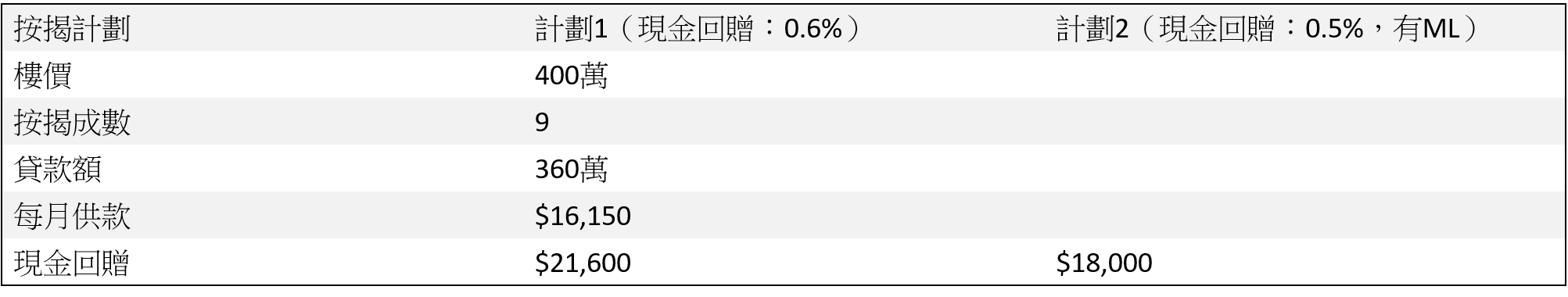 「90後」Dison早前抽中白表居屋第二市場計劃(俗稱「白居二」),可以用免補地價方式買入居屋單位,最後選中天水圍400萬屋苑上車。由於首期有限,他決定申請九成按揭,借貸360萬,供款25年。由於未補價的居屋只能承造P按,故銀行最終開出兩個offer,第1個計劃為P-2.5%(實際按息2.5%),現金回贈為0.6%,第2個計劃按息一致,但提供按揭存款掛鈎戶口(Mortgage-link),但現金回贈減少至0.5%。究竟哪個計劃較為著數?